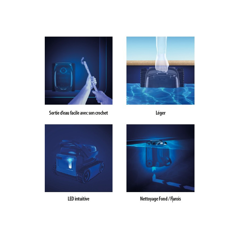 - Nettoyage efficace du fond et des parois (2h), charge rapide (<4h)