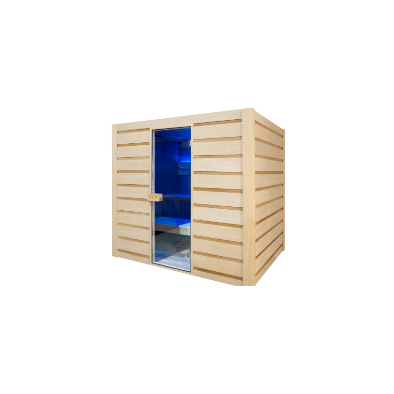 Tous les paramètres ont été étudiés pour que ce sauna préserve l'énergie. Ses parois sont isolées, l'espace sous les bancs est fermé permettant ainsi une isolation optimale. La fermeture et la structure de la porte ont été étudiées pour éviter toute déperdition.